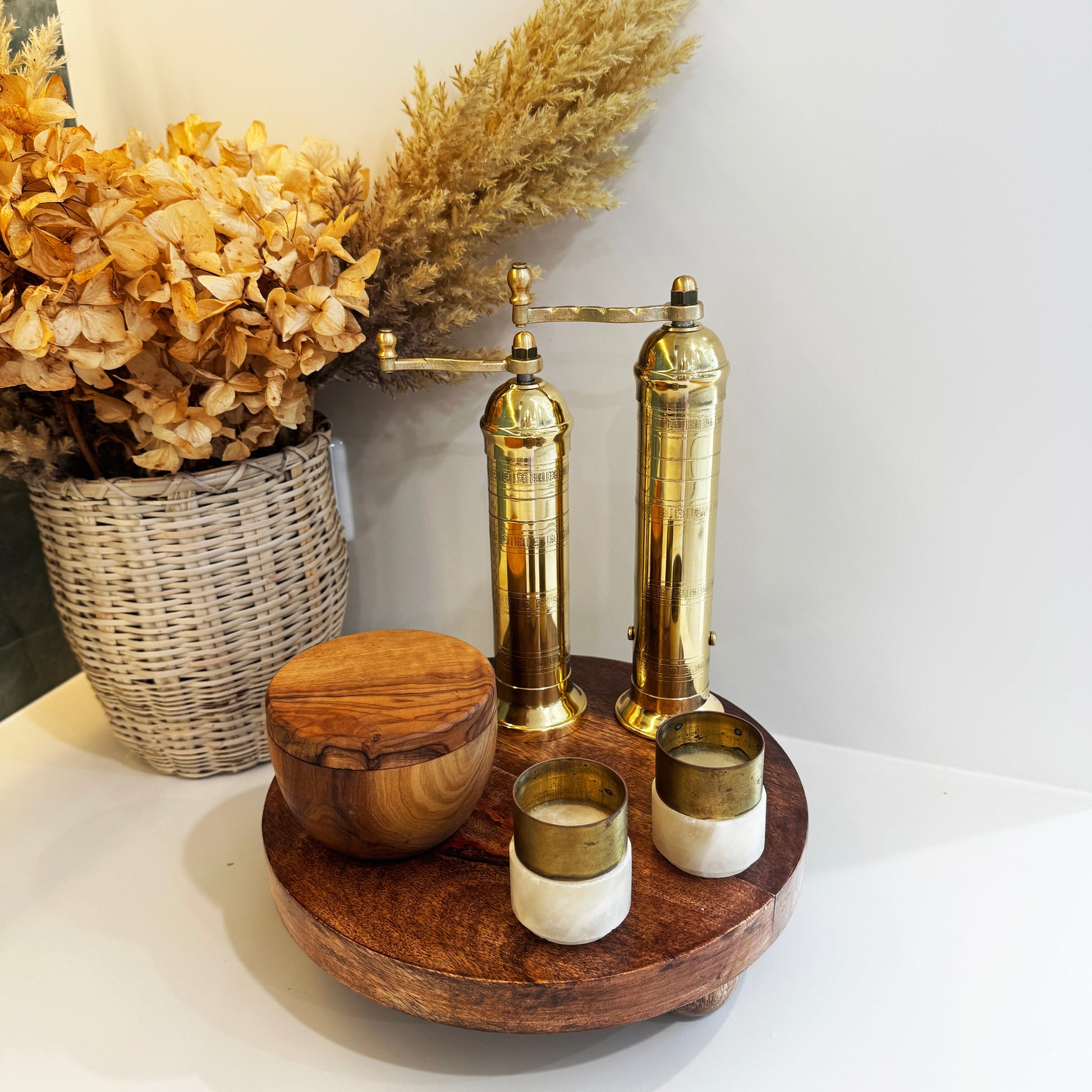 The set includes our signature Brass Salt and Pepper Mills, a Round Wood Riser for elegant display, a Salt Cellar for effortless seasoning, and a pair of Alabaster Candle Holders that cast a soft, ambient light. Together, they form a harmonious centerpiece that blends function with timeless beauty.