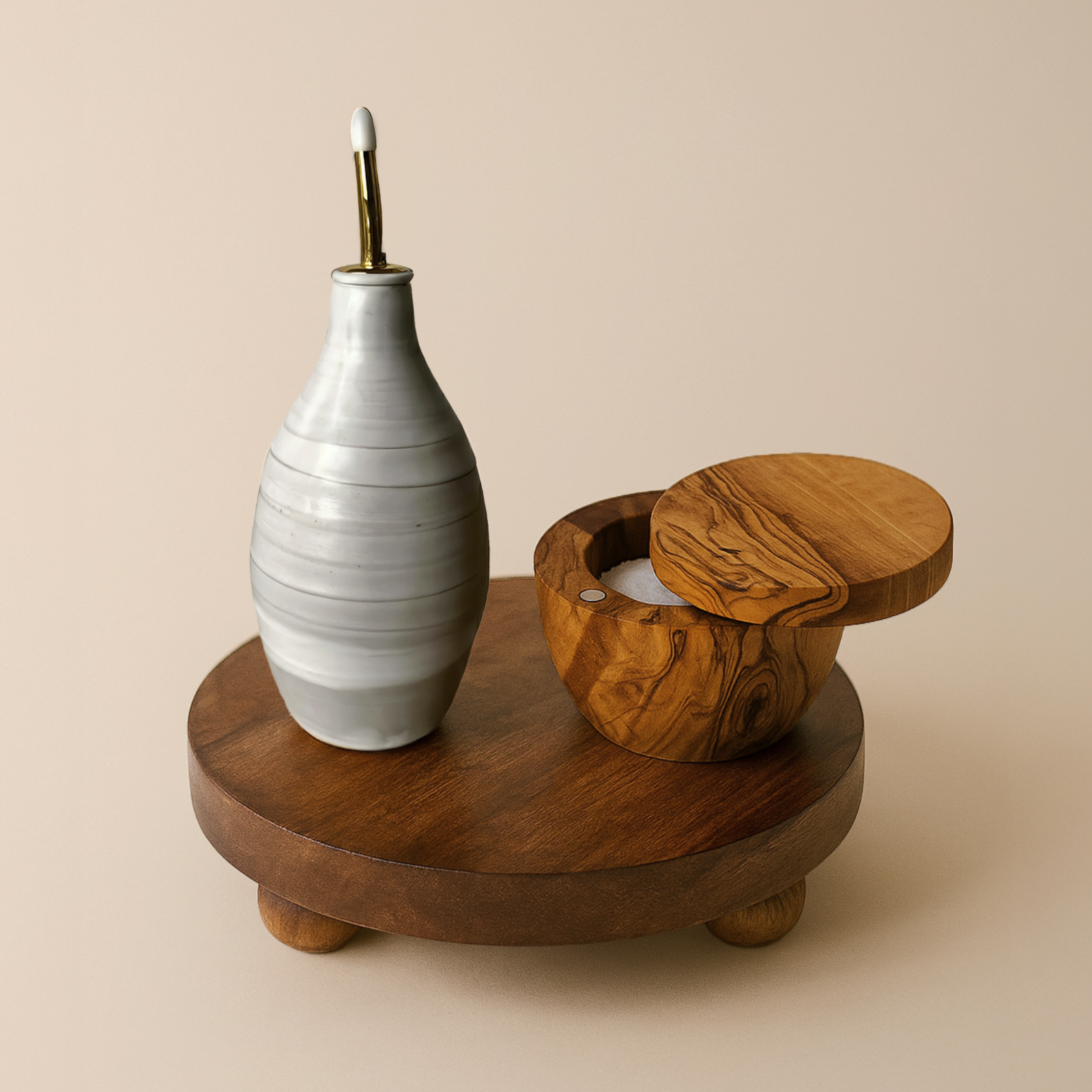 The Pour & Pinch Trio brings everyday cooking to life with three beautifully crafted essentials for your kitchen. Our handmade oil cruet pours with ease, the wooden riser adds a touch of height and quiet charm, and the salt cellar keeps your favorite flakes right at your fingertips.